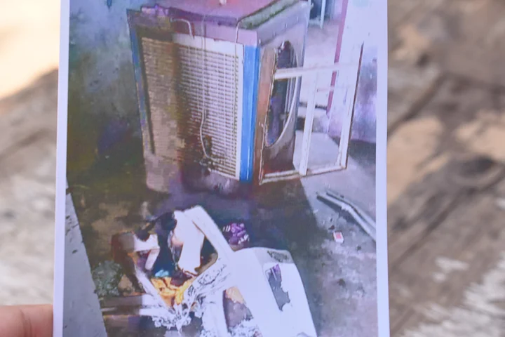 Yasmin Mehmud (36) with the photos of all that was burnt — cooler, chair, refrigerator. She also found 5 gallon of gasoline in her house which was used to burn the house.
