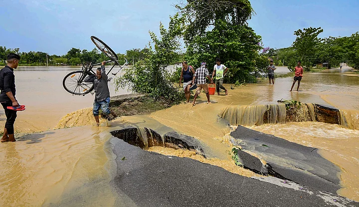 Villagers cross a damaged road after heavy rainfall at Kampur village in Nagaon district on 19 May.