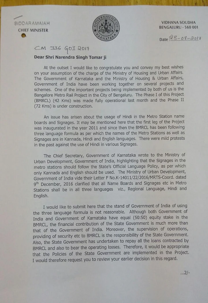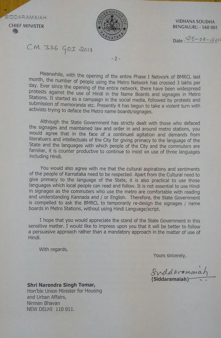 The Chief Minister of Karnataka Siddaramaiah wrote a letter to Narendra Singh Tomar, the Urban Development minister, asking for the removal of Hindi sign-boards from Bengaluru’s metro stations.
