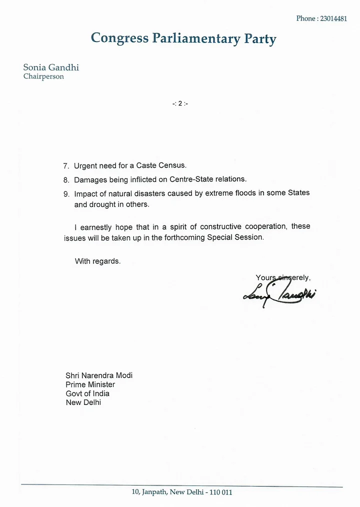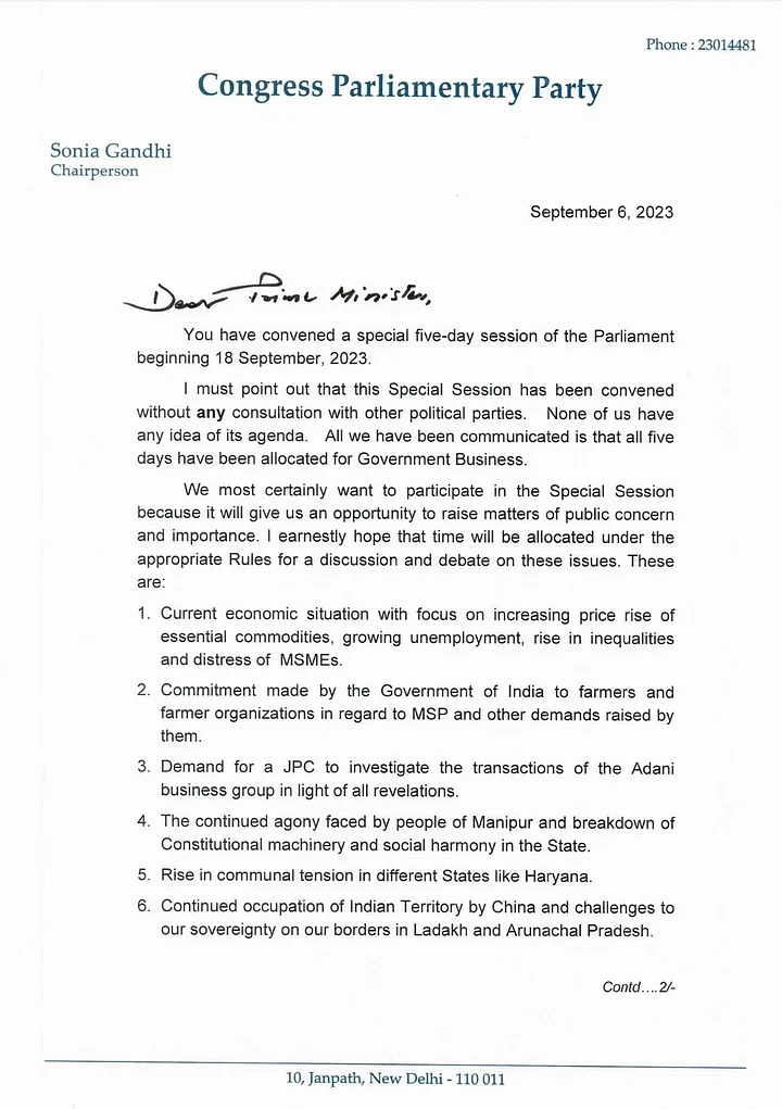 Gandhi, who is the chairperson of Congress' Parliamentary Committee, also said, "the Special Session has been convened without any consultation with other political parties."