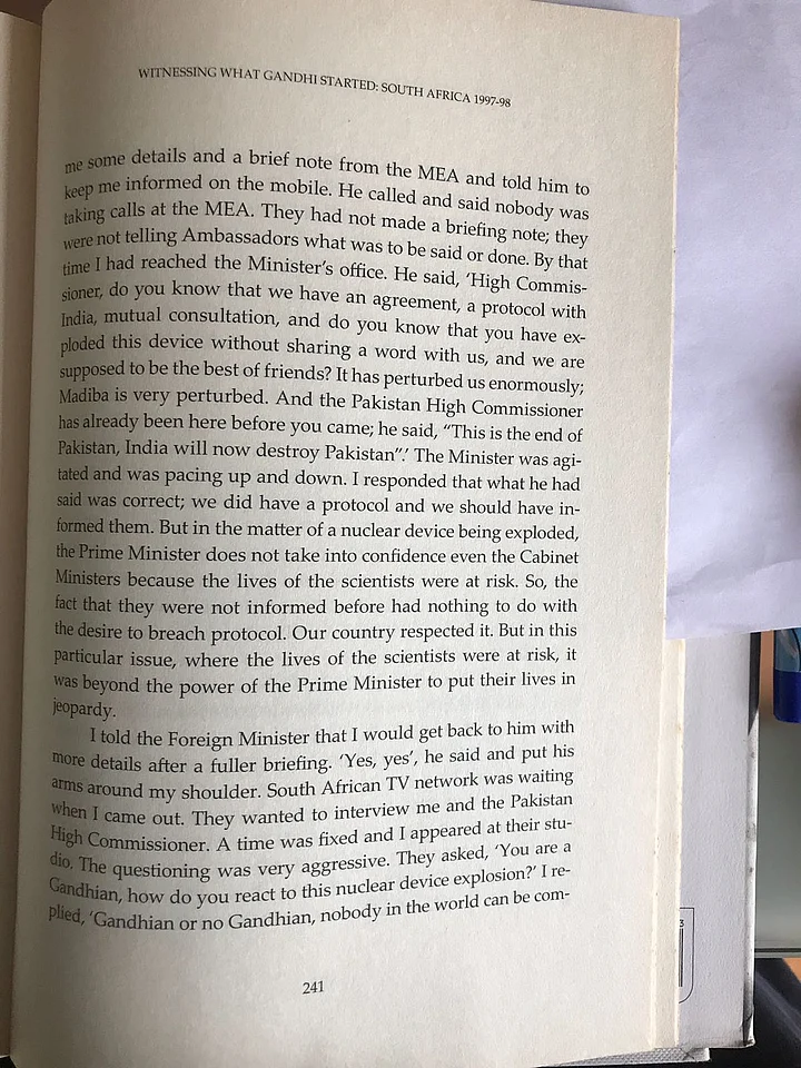 Jain’s memoirs, however, tell a different story. According to him, he had not expressed any opposition to the tests to the South Africans, and this perception arose mistakenly after an appearance by him on South African TV network just after the news broke.