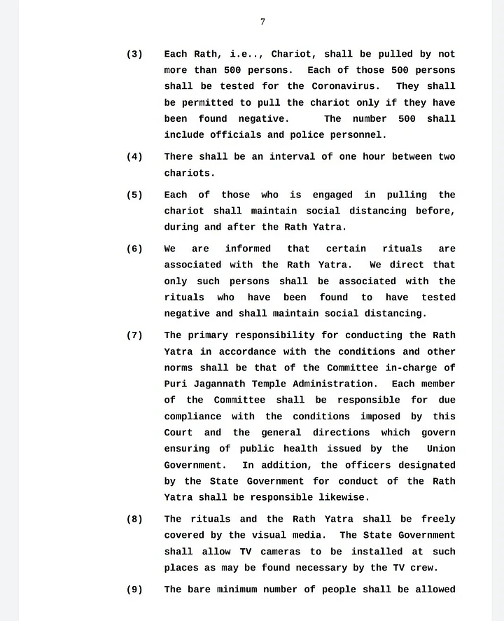 The apex court has imposed some guidelines and restrictions in its final order. It has asked the government to ensure that the airport, railway stations, and bus stands are closed during Rath Yatra, and curfew is imposed in Puri city during the time when the Rath Yatra chariots are taken in procession.