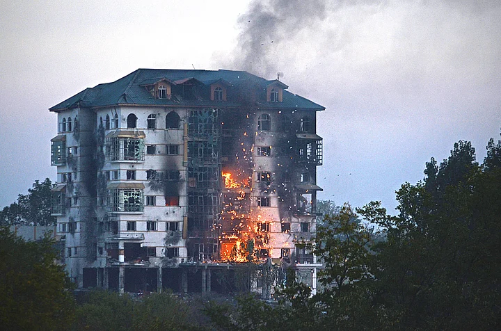 On Monday, security forces battled a group of heavily-armed militants sheltered inside a government building, firing incendiary material that sparked a fire in the complex.