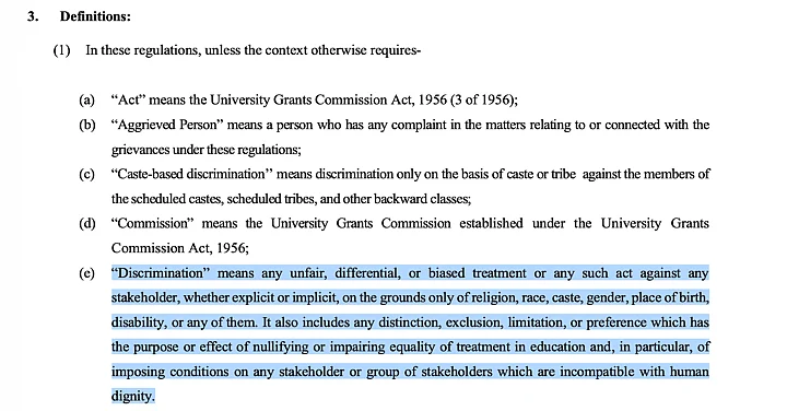 However, social activist Anand Teltumbde argued that Clause 3c is in addition to Clause 3e, which includes everybody. Clause 3e defines discrimination as “any unfair, differential, or biased treatment or any such act against any stakeholder, whether explicit or implicit, on the grounds only of religion, race, caste, gender, place of birth, disability, or any of them,” where stakeholder includes students, faculty members and non-teaching staff. It is similar to the 2012 regulations, only those were restricted only to students and didn’t include teaching/non-teaching staff.