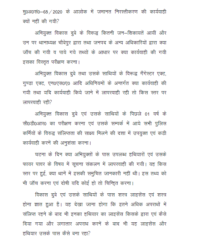 The SIT is expected to probe the adequacy of the actions taken against Dubey and his accomplices’ crimes, the credibility of past investigations against Dubey and his criminal history, how was Dubey able to walk free despite such a massive criminal history, probing lapses on the day of the shootout of eight policemen on 3 July, how was he able to procure licences for the weapons he possessed and so on.