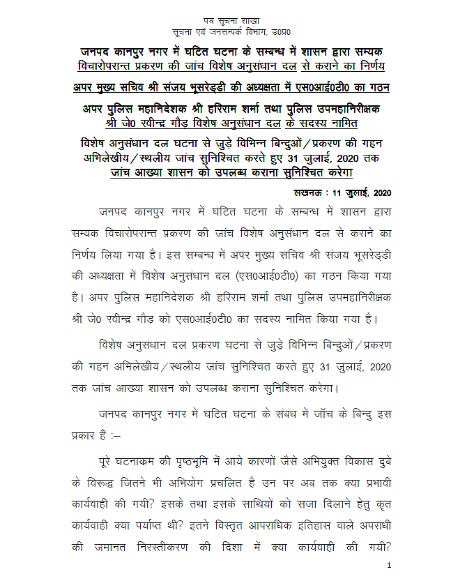 The Uttar Pradesh government on Saturday, 11 July ordered that a Special Investigation Team (SIT), headed by Additional Chief Secretary Sanjay Bhoosreddy, will conduct the investigation in the Kanpur encounter case of Vikas Dubey.