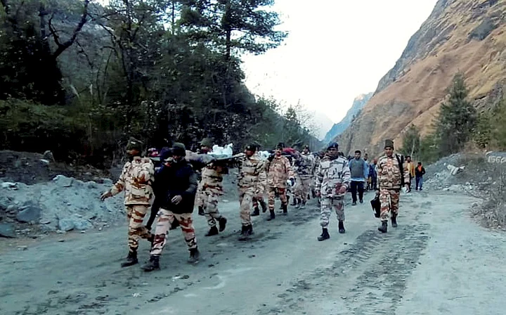 Earlier visuals shared by the ITBP showed personnel helping people clamber out of the tunnel. ITBP personnel were later seen carrying rescued persons on stretchers to the nearest road for medical treatment.