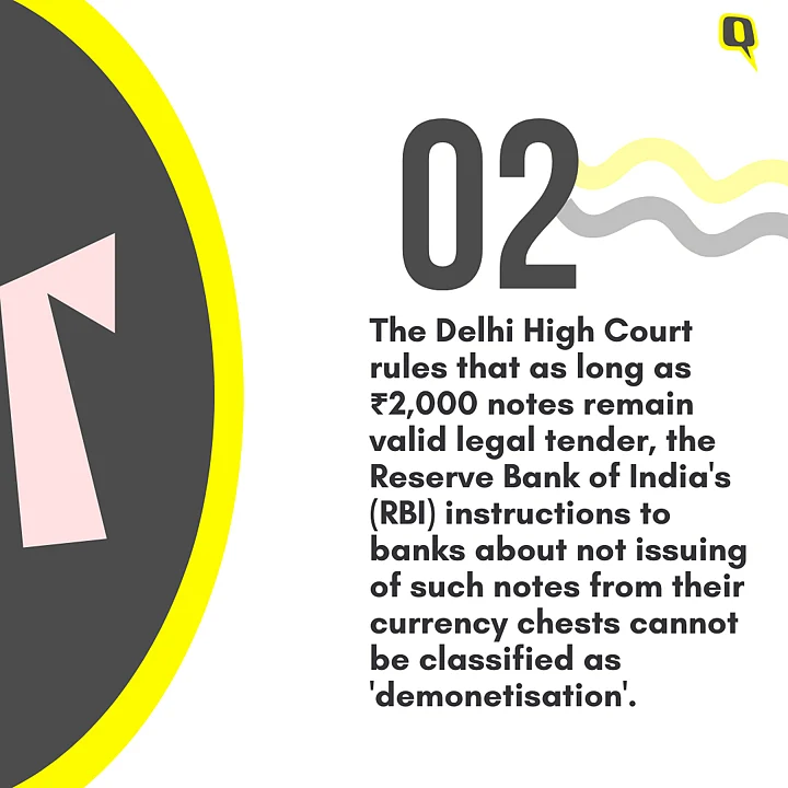 The Delhi High Court has ruled that as long as ₹2,000 notes remain valid legal tender, the Reserve Bank of India's (RBI) instructions to banks about not issuing of such notes from their currency chests cannot be classified as 'demonetisation'.