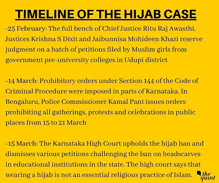 On Essential Religious Practice: Dismissing the petitions filed by Muslim girl students, seeking protection of their right to wear hijab in educational institutions in Karnataka, the Karnataka High Court said: