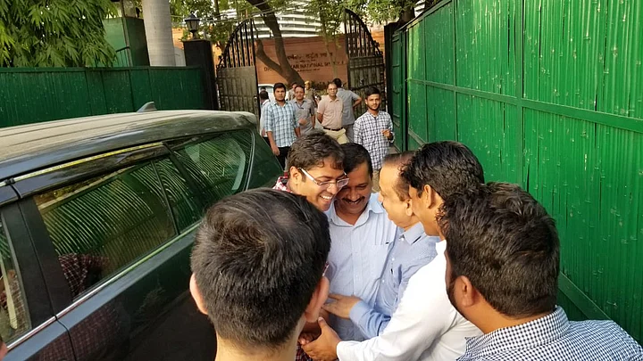 Delhi chief minister Arvind Kejriwal celebrates with party workers after ending his 9-day sit-in at L-G Anil Baijal’s residence.