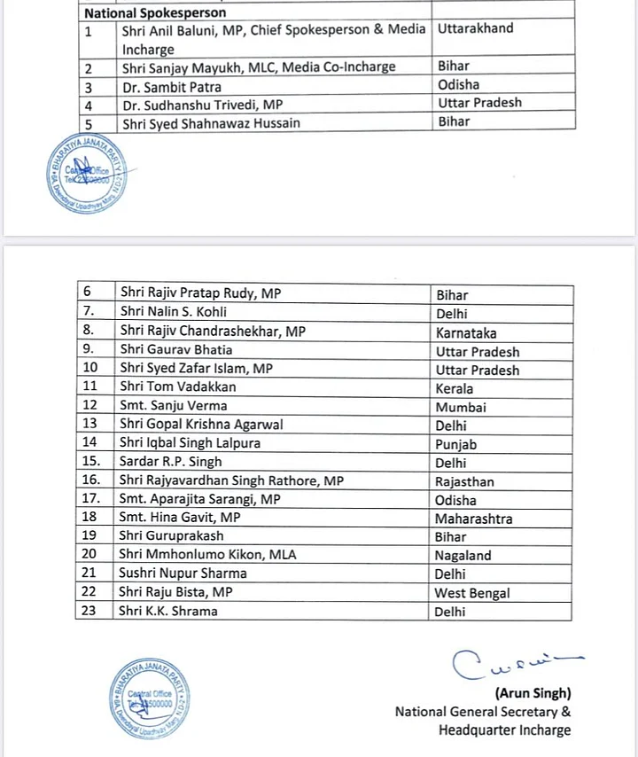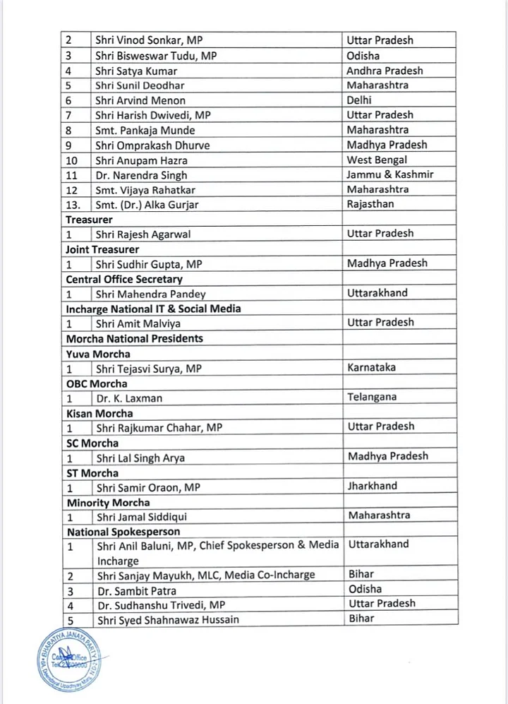 The party has also increased the number of national spokespersons to 23, with Anil Baluni being the chief spokesperson and media in-charge.