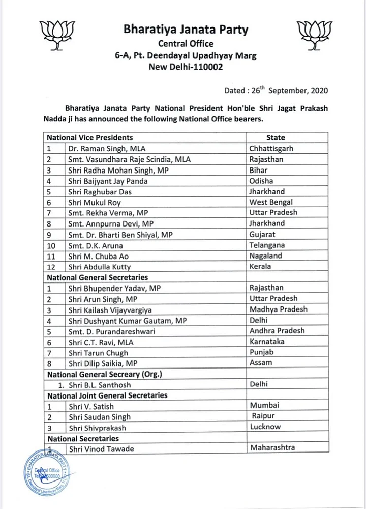 The party has replaced Ram Madhav, P Muralidhar Rao, Anil Jain and Saroj Pandey as general secretaries with new faces, reported news agency PTI. The eight-member team of national general secretaries now includes Bhupender Yadav, Arun Singh, Kailash Vijayvargiya, Dushyant Kumar Gautam, D Purandareshwari, CT Ravi, Tarun Chugh and Dilip Saikia, besides BL Santosh as national general secretary (organisation).