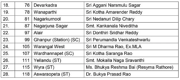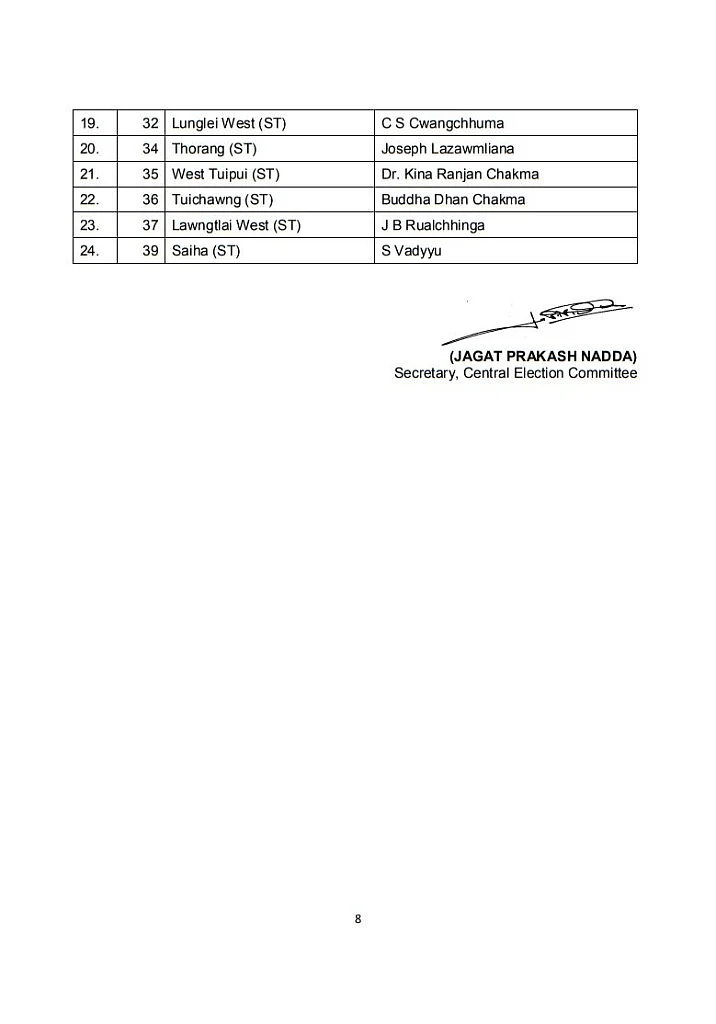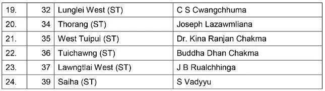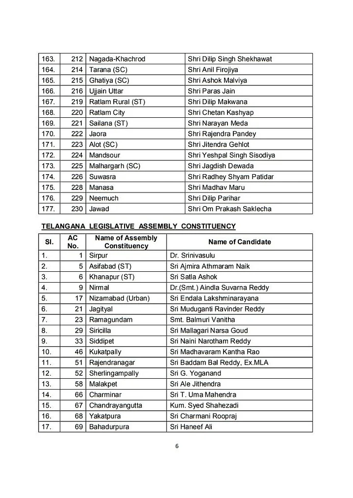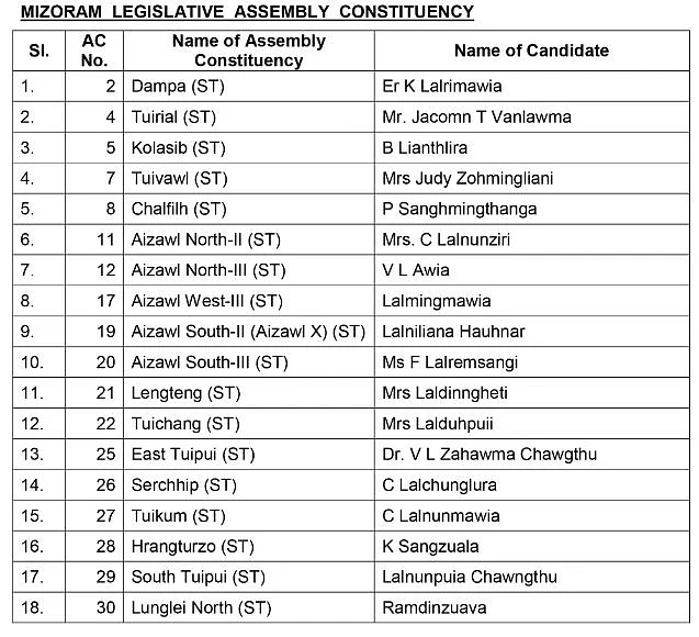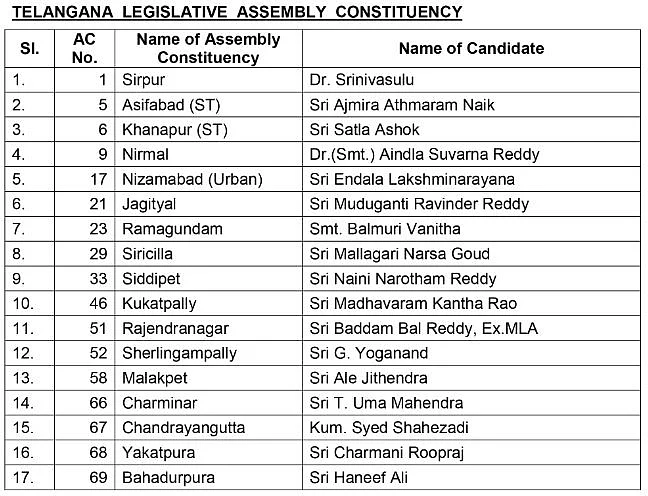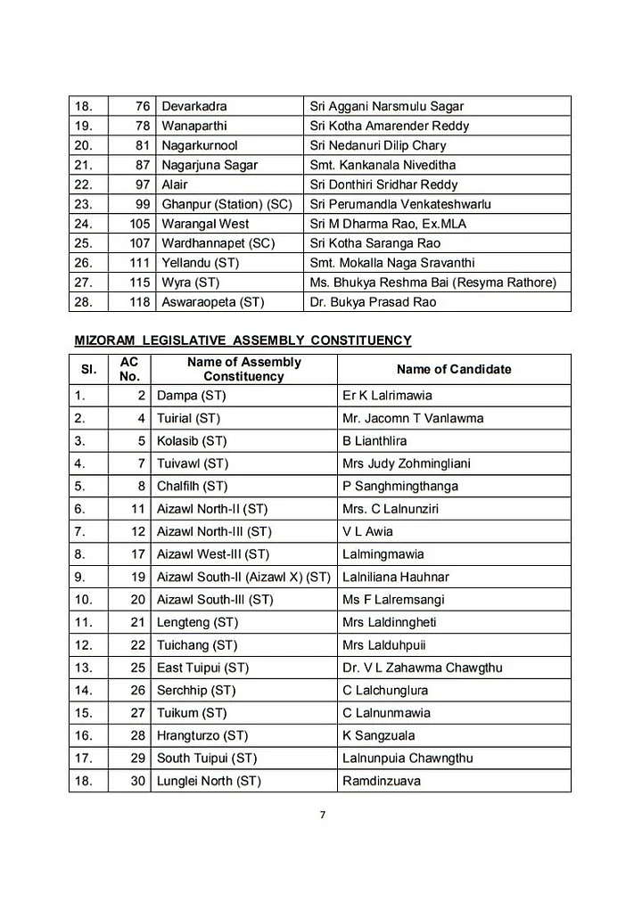 Lists of 24 and 28 candidates were released for Mizoram and Telangana respectively. The party had declared 13 candidates in Mizoram before the announcement on 2 November.