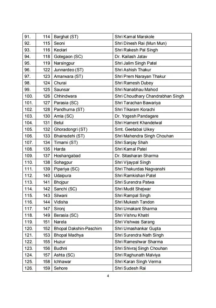 The fourth list named seven candidates. Notably, Madhya Pradesh Minister and BJP leader Kusum Mehdele has not been given a ticket to contest from Panna, from where she is a sitting MLA. Instead, BJP’s Brijendra Singh will be contesting from Panna in the upcoming elections.