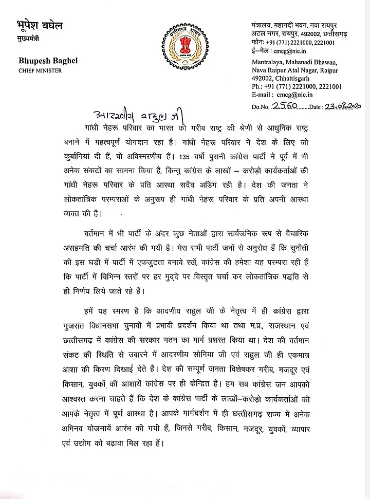 “Amid every challenge faced by the party, Sonia ji and Rahul ji have always been a ray of hope. The people and party workers of Chhattisgarh and the country stand by you. It is your leadership that will rescue the country in these difficult times,” he tweeted, along with a copy of the letter.