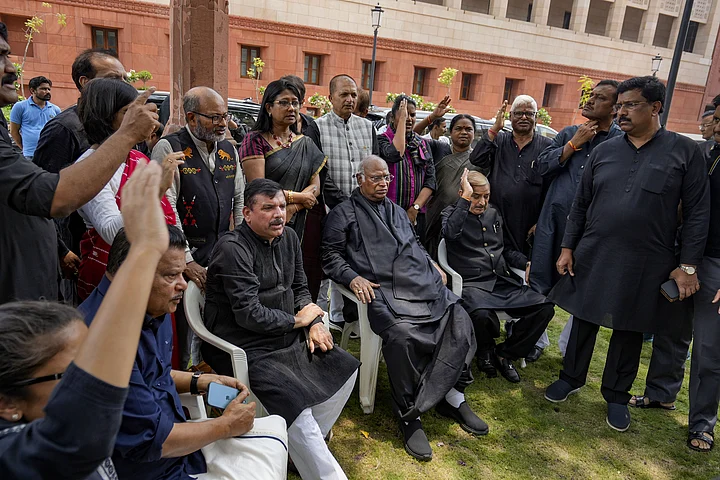 AP MP Sanjay Singh with Leader of Opposition in Rajya Sabha Mallikarjun Kharge and other opposition MPs during a protest over his suspension from Rajya Sabha, at Parliament House complex amid the Monsoon session, in New Delhi, Thursday, July 27, 2023. MPs belonging to the Oppositions INDIA bloc are dressed in black as a mark of protest against the government over the Manipur issue.