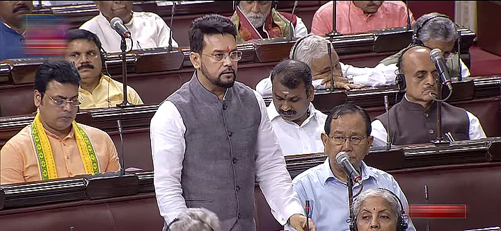 Union Minister Anurag Thakur speaks in the Rajya Sabha during the Monsoon session of Parliament, in New Delhi, Thursday, July 27, 2023.