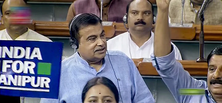 Union Minister Nitin Gadkari speaks in the Lok Sabha during the Monsoon session of Parliament, in New Delhi, Thursday, July 27, 2023.