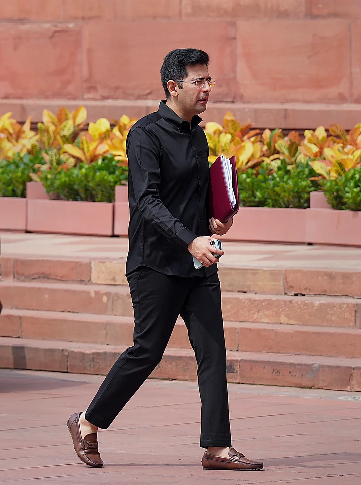 AP MP Raghav Chadha in black attire as a mark of protest over Manipur issue arrives at Parliament House complex during the Monsoon session, in New Delhi, Thursday, July 27, 2023