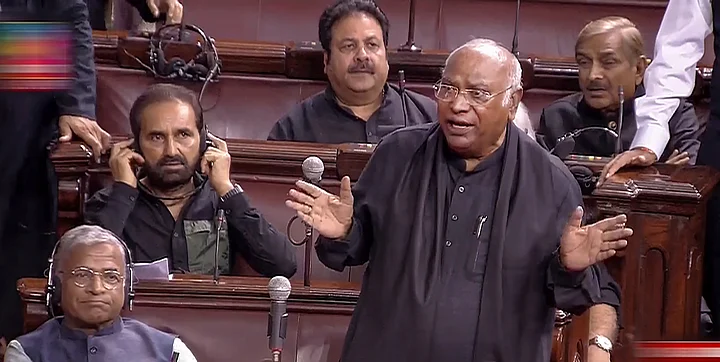 Leader of Opposition in the Rajya Sabha Mallikarjun Kharge speaks in the House during the Monsoon session of Parliament, in New Delhi, Thursday, July 27, 2023.