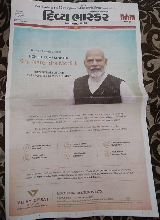 Private companies releasing ads to thank the government for GST reforms was one thing. But this time, newspapers themselves published advertisements inviting readers to place ads wishing Prime Minister Modi on his 75th birthday. As per the Finance express report, Over 220 advertisers took out print ads to wish PM Modi on his 75th birthday. Many of these ads carry the PM Photo. For the Reply of the RTI, it is clearer that all these advertisements were published without any permission from the ministry.