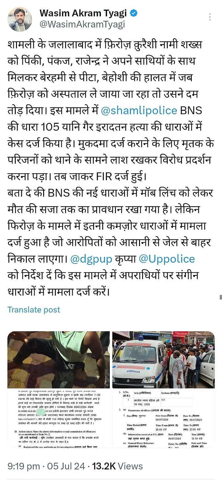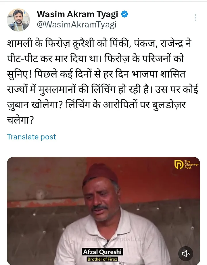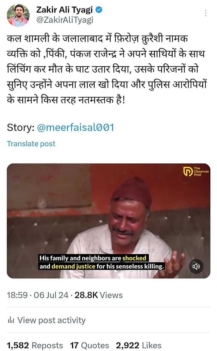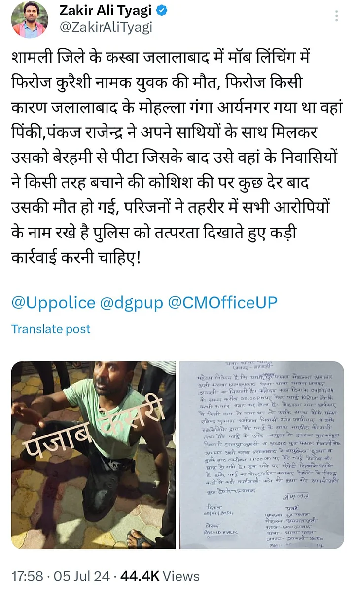 Journalist Zakir Ali Tyagi claimed in a social media post that Qureshi's killing was a mob lynching. Tyagi has now been booked along with Wasim Akram Tyagi, Asif Rana, Ahmed Raza Khan and Saif Allahabadi. Three of the others had merely shared Zakir Tyagi's post.