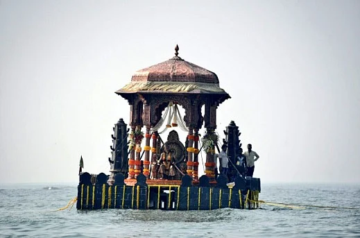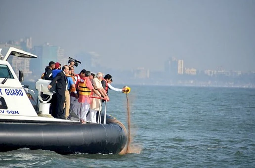- 01/03PM Narendra Modi and other dignitaries in the Arabian Sea for the foundation-laying ceremony of the proposed Shivaji memorial. (Photo Courtesy: Twitter/@CMOMaharashtra)