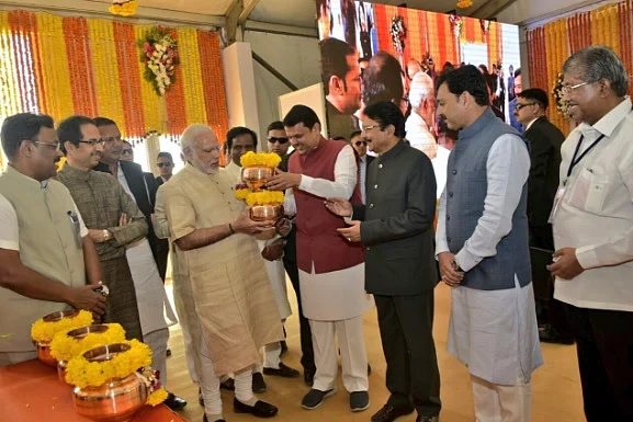 - 03/03CM Devendra Fadnavis hands over the kalash of water & soil collected from all over Maharashtra to PM Modi as Shiv Sena Chief Uddhav Thackeray and others look on. (Photo Courtesy: Twitter/@CMOMaharashtra)