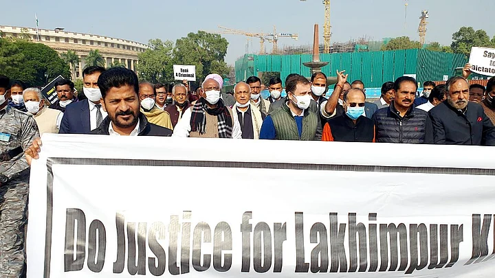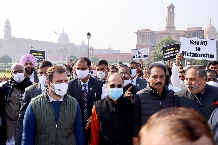 Several Opposition MPs, led by Congress' Rahul Gandhi, on Tuesday, 21 December, marched to Vijay Chowk in Delhi demanding suspension of Minister of State (MoS) for Home Ajay Mishra Teni over the Lakhimpur Kheri matter.