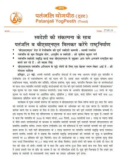While reports on Monday, 28 May, suggested that Patanjali was officially entering the telecom sector after a tie-up with BSNL, according to the press release, the tie-up is exclusively for Patanjali employees.
