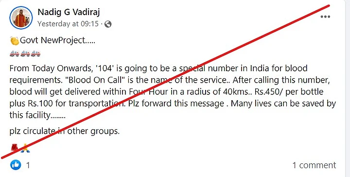 Clearly, a now-discontinued ‘blood on call - (104)' service from Maharashtra is being falsely shared as a nationwide service.