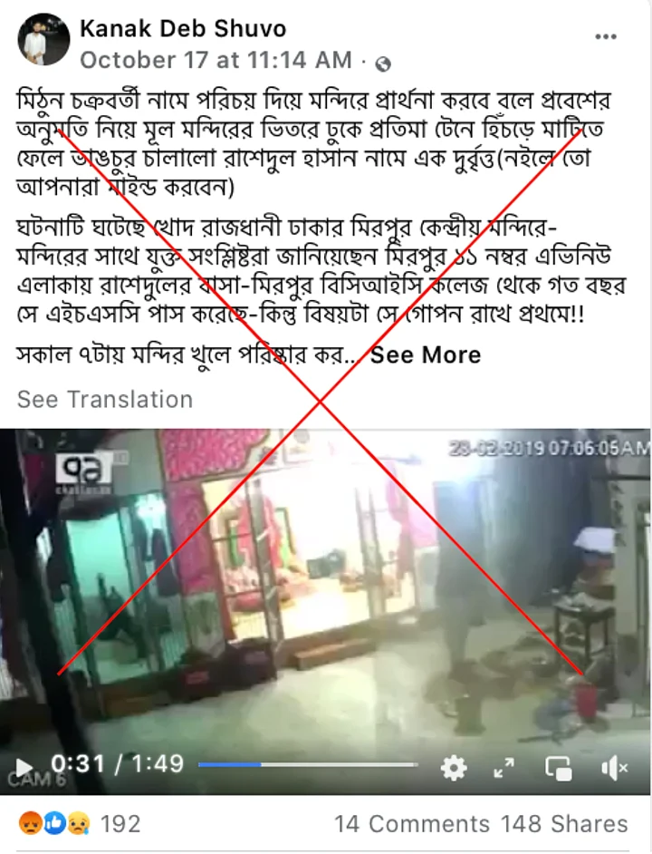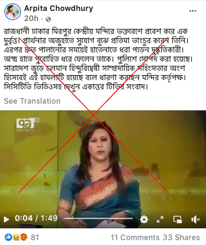 The claim, originally in Bengali, along with the video mentions, "Hindu temples were attacked again".