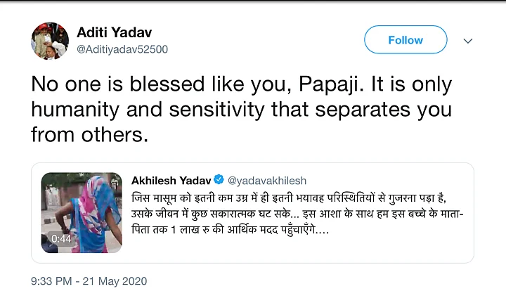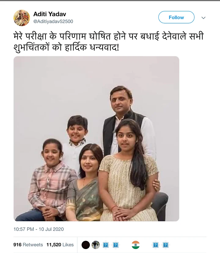 Looking for archives for Aditiyadav52500's Twitter account led us to older tweets by the account under the name 'Aditi Yadav', calling Akhilesh 'papaji' and thanking people for their kind words after 'her' examination results were announced.