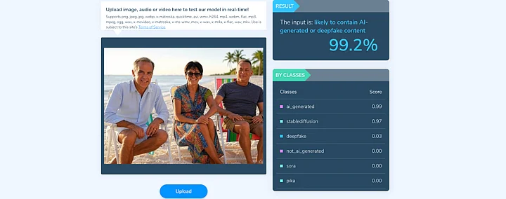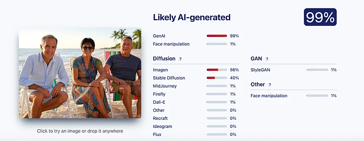 We then ran the image on AI-detection websites Hive Moderation and Sight Engine. The results showed that the image contained 99 percent AI-generated content.