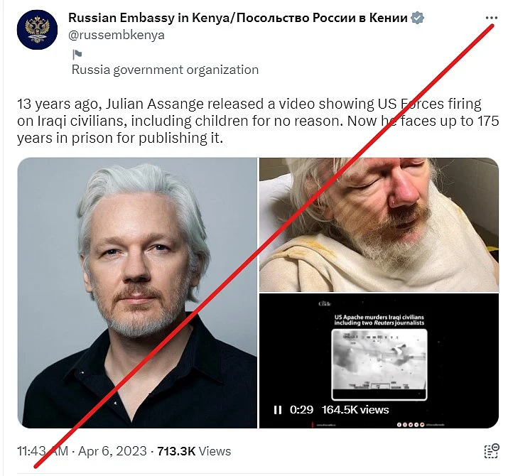 Who shared it?: Along with several social media users, the Russian Embassy in Kenya also tweeted this photo stating that Assange is in jail because he had released a video of United States Forces firing on Iraqi civilians 13 years ago.