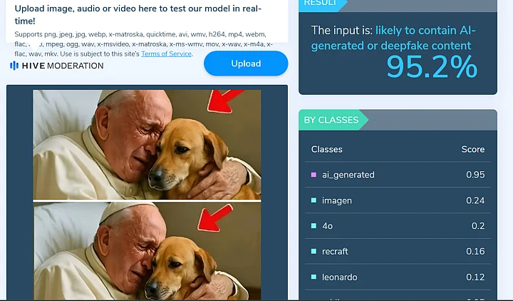Hive Moderation concluded that this image is 95.2 percent AI-generated while Sight Engine returned with 99 percent.