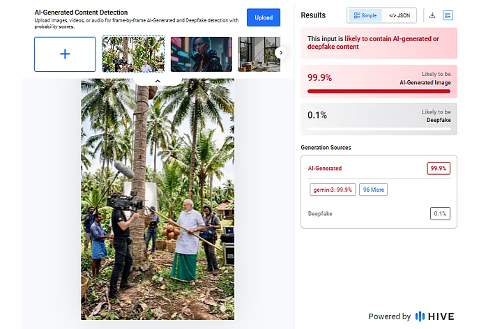 This led us to run the image on AI-detection tools such as Hive Moderation and Sightengine which concluded that the viral photo was AI-generated.