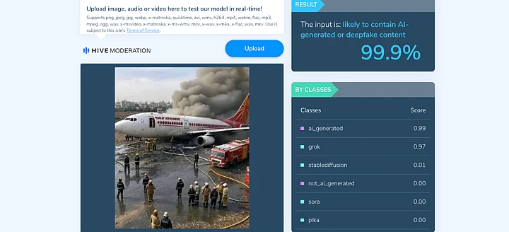We, then, ran the image on AI-detection websites such as Hive Moderation and Sightengine. Both platforms declared the image as 'likely AI." Swipe right to see the report.