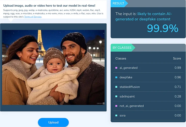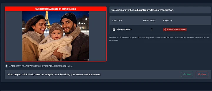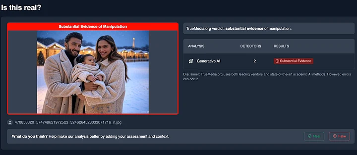 It noted that the images looked exceptionally refined with sleek skin textures, ideal lighting, and flawless element integration, traits that are typical of AI-generated visuals. Moreover, the image does not exhibit any clear artifacts or anomalies commonly associated with digital altercations like warping or uneven lighting typically present in fake images.