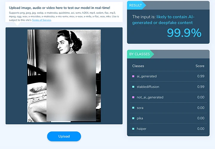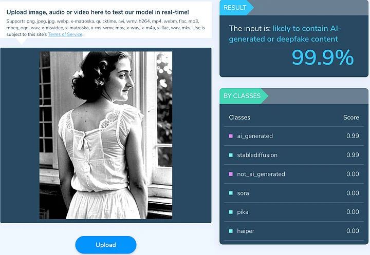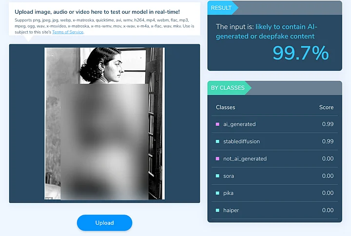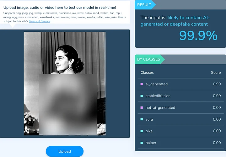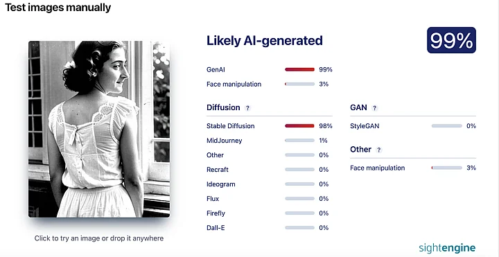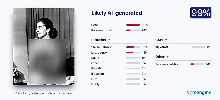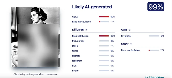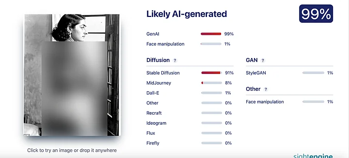 AI-dectection websites: We ran the image on two AI-detection websites such as Hive Moderation and Sightengine AI. Both platforms declared all images as AI-generated.