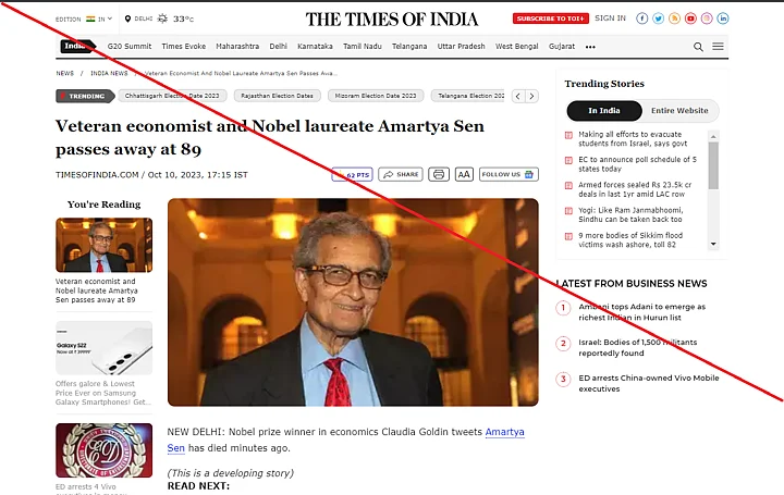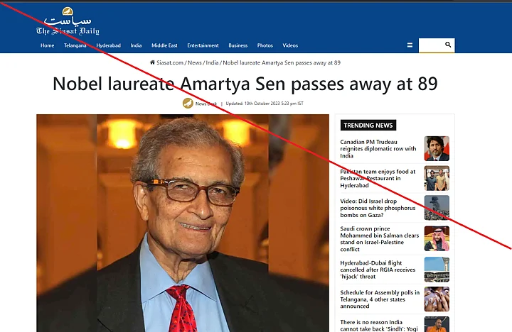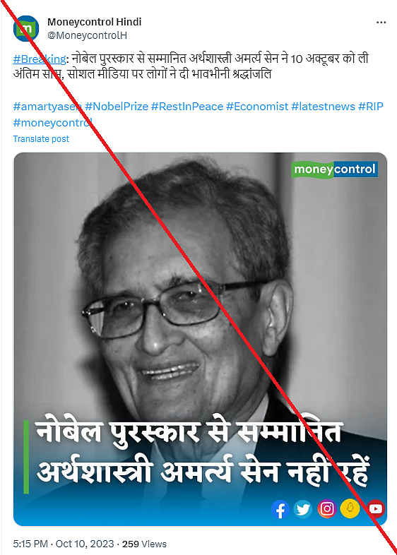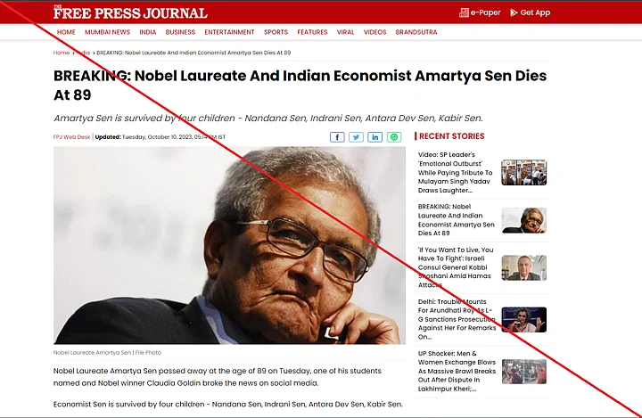 Most of these organisations reported the death of Sen on the basis of a tweet shared from an X (formerly Twitter) account in the name of Nobel prize winner 'Claudia Goldin'.