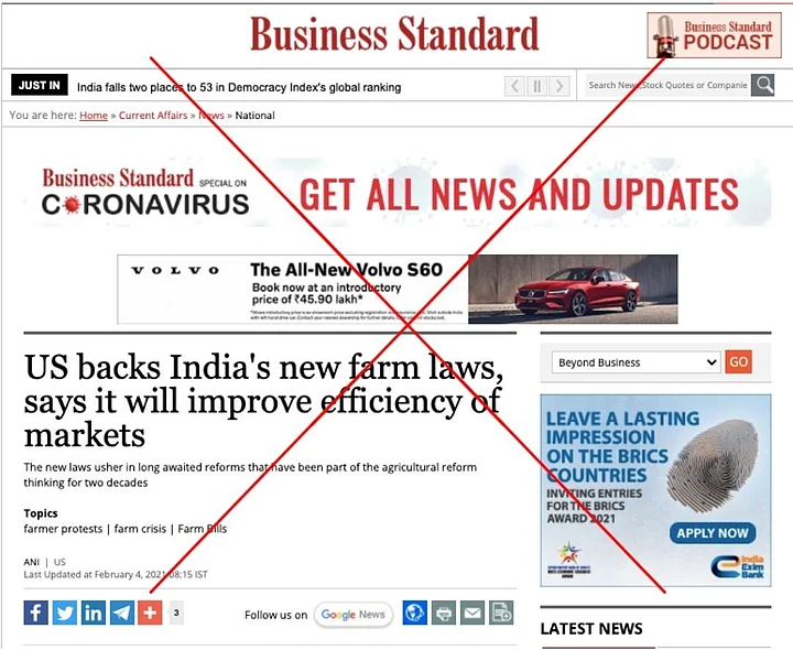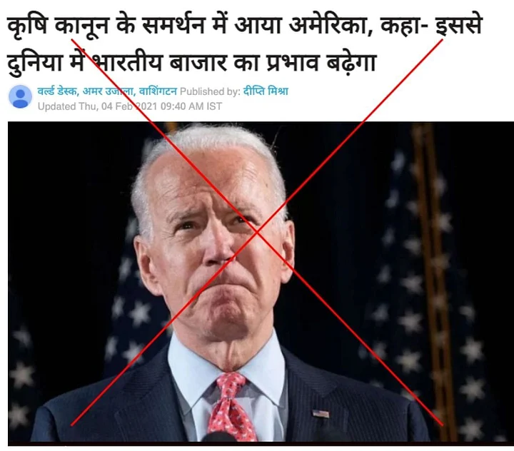 However, we found that the said report has misrepresented the statement by the US government, which stated four major points. While the ANI report mentioned three of them, including the part which says that ‘in general’ the US government supports India's farm laws, it failed to mention that the statement criticised the ban on internet and the steps that curb the fundamental freedom of expression of the protesters.