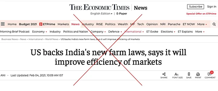 Evidently, a report by news wire agency ANI, which omitted a very crucial statement in the the US government spokesperson’s press brief on the farmers’ protest in India was subsequently picked by several news outlets, and amplified by many on social media.