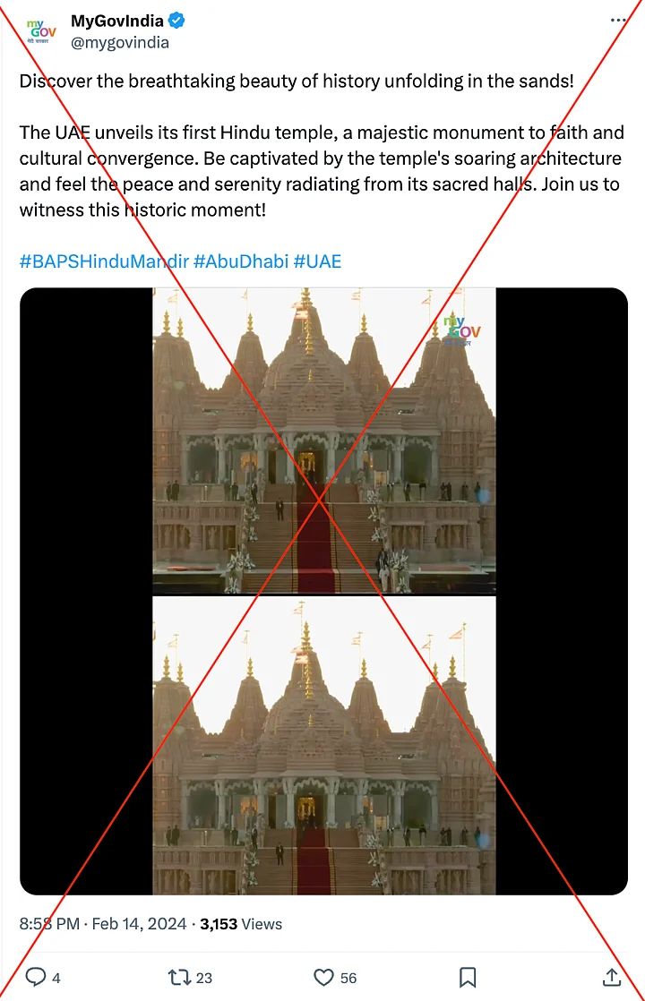 Is it true?: No. While it is the first Hindu temple in Abu Dhabi, it is not first in the country. The city of Dubai has had multiple Hindu temples since 1958.