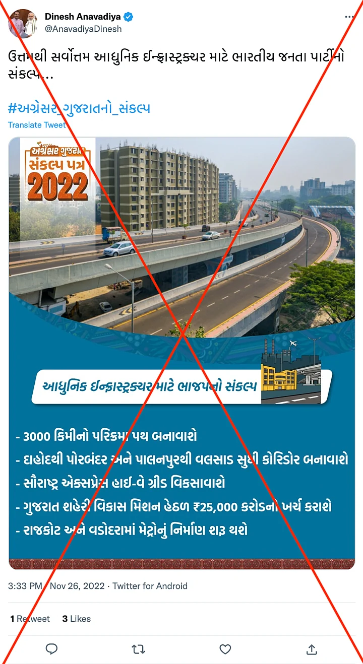 A Bharatiya Janata Party (BJP) campaign graphic in Gujarati, showing a multilane flyover, is being shared on social media with a claim that it shows the state of infrastructural development in Gujarat.