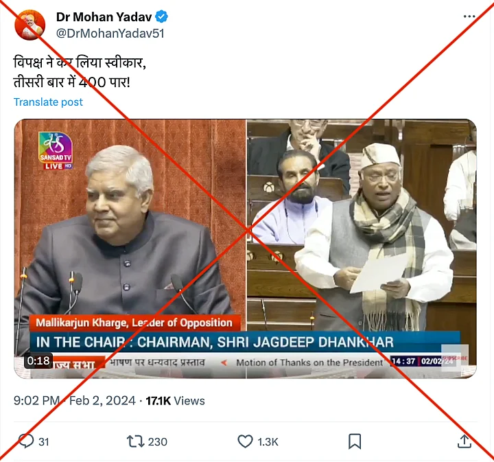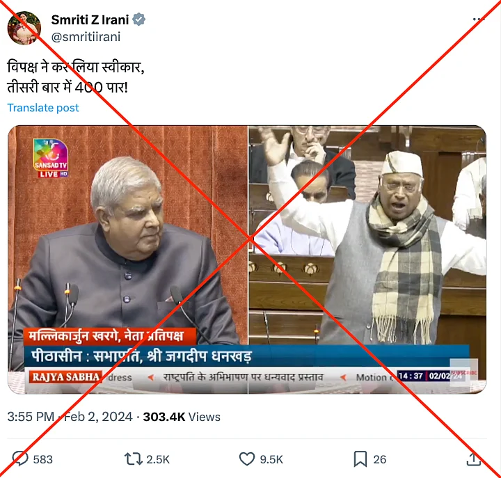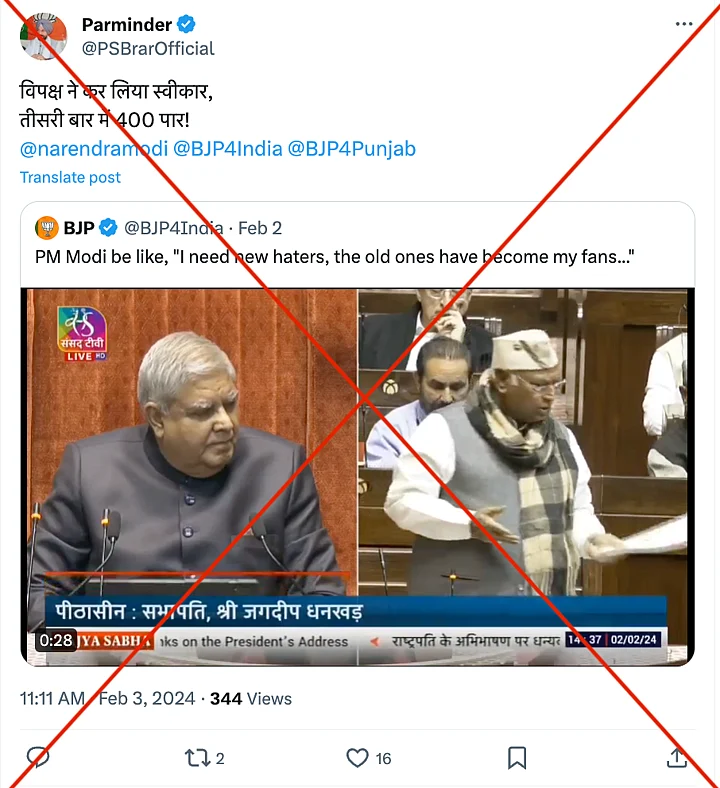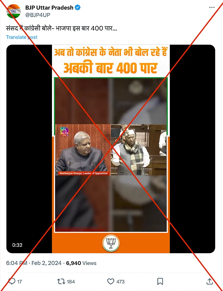 The claim: The video is being shared to imply that Kharge, who is the Leader of the Opposition in the Rajya Sabha, agreed with the BJP's slogan about securing more than 400 out of 545 seats in the Lok Sabha in the upcoming elections.