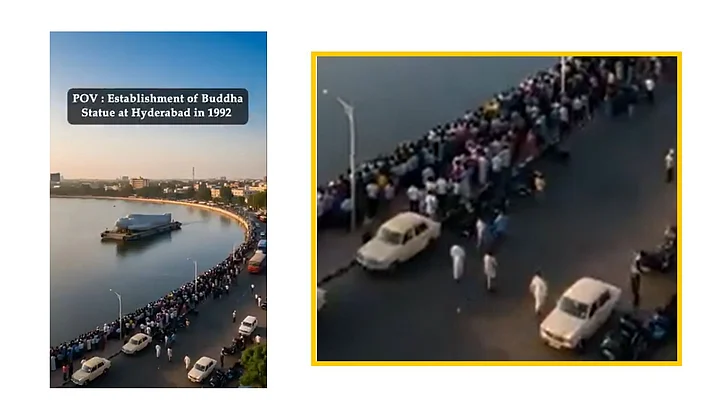 A video of a huge Buddha statue being transported and then installed is going viral on the internet with a claim that it shows real visuals of the establishment of the Buddha statue in 1992 in Hyderabad, Telangana.