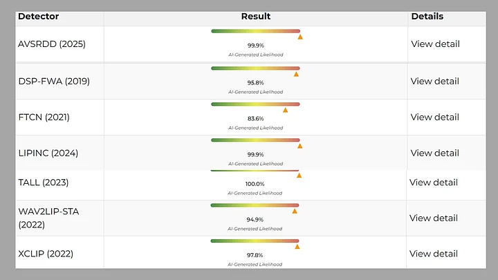 Seven detectors of the first tool showed conclusively results indicating that the viral video was indeed AI-generated/manipulated.