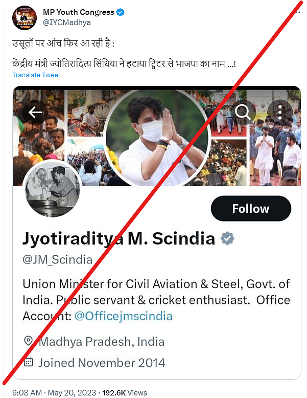 A screenshot of Bharatiya Janata Party (BJP) leader and Union Civil Aviation Minister Jyotiraditya Scindia's Twitter account is going viral on social media with a claim that he recently removed 'BJP' from his bio.