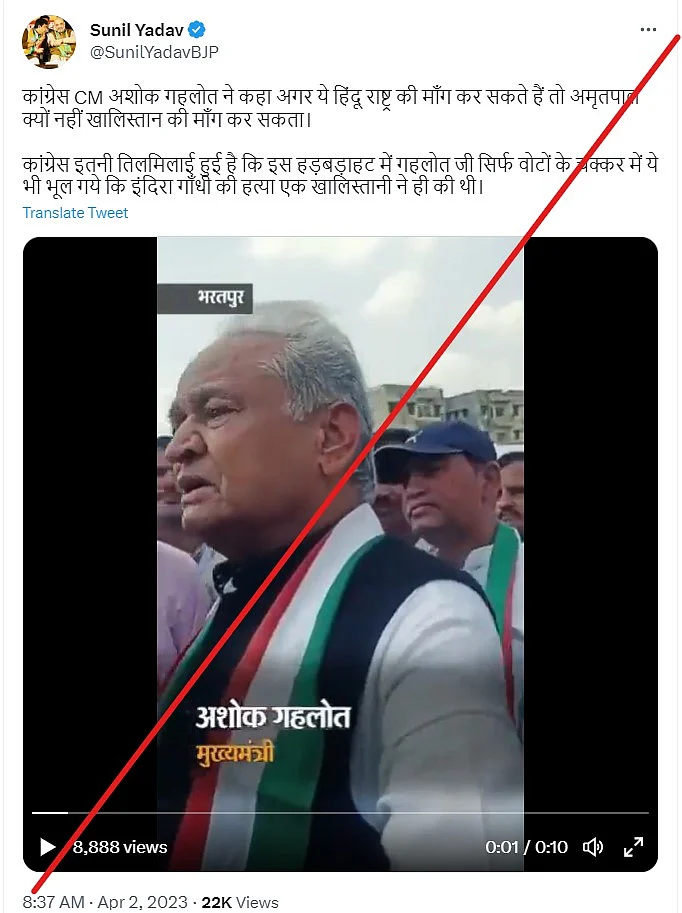 The report by India Today from 31 March stated that Gehlot blamed the “Hindu Rashtra” ideology, allegedly professed by the BJP, for the rise of separatists like Singh.